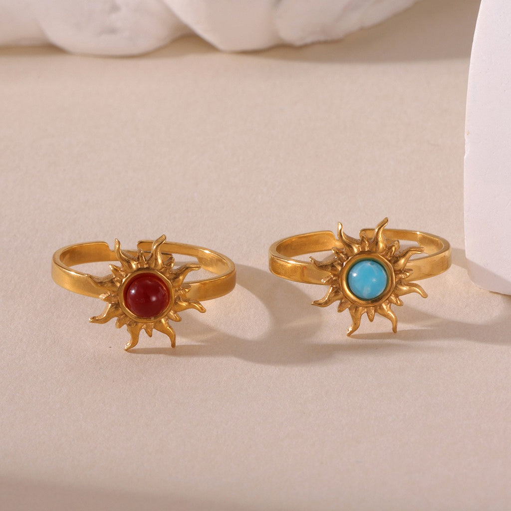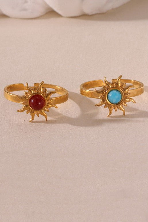 18K Stainless Steel Tarnish-Free Adjustable Abstract natural stone sun blast Ring. Featuring a delicate abstract with natural stone in the middle with sun blast design, crafted from premium 18K stainless steel, it ensures a tarnish-free shine and long-lasting durability. The adjustable design provides a comfortable and customizable fit.