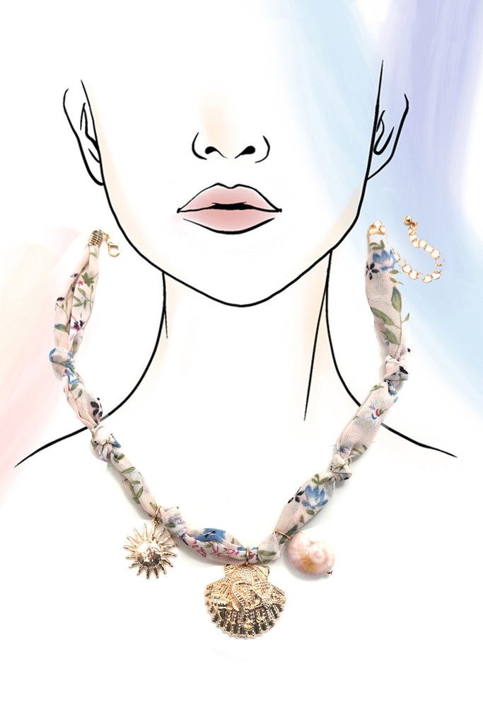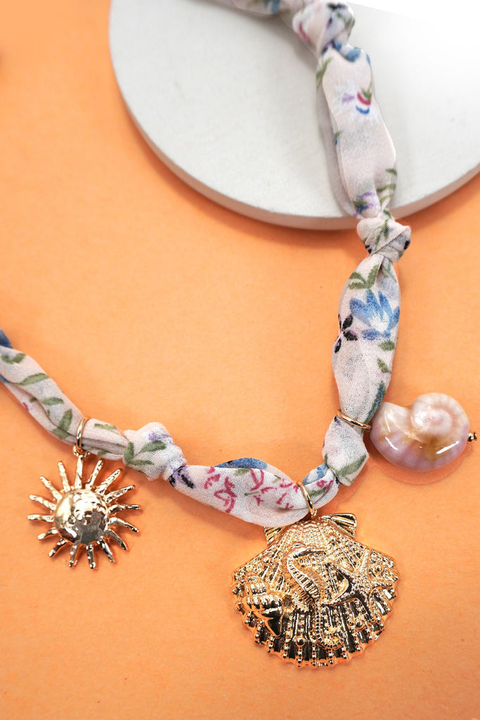 Boho-chic with this Scarf Charm Necklace, featuring a soft knotted scarf adorned with an eclectic mix of charms. Highlighted by a seashell, sun, and ceramic shell, each piece brings a coastal, free-spirited vibe to your look.