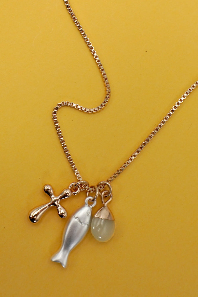 This trendy piece fuses nautical charm with modern style. Its goldfish-shaped pendant features with cross, jade stone pendant and a matte silver finish fish for a polished look. A cluster of sea life charms adds a whimsical, ocean-inspired flair, making this necklace a chic statement in fashion jewelry.