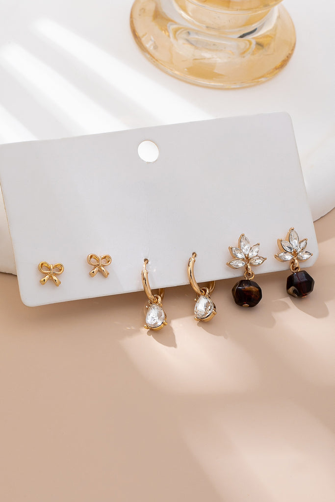 Trio gold-tone earrings on a white card: infinity-stud pair, bow-stud pair, mini hoops with teardrop crystal drops, and two floral studs-one with clear crystal petals, one with dark gem centers. Sparkling mix for versatile wear.