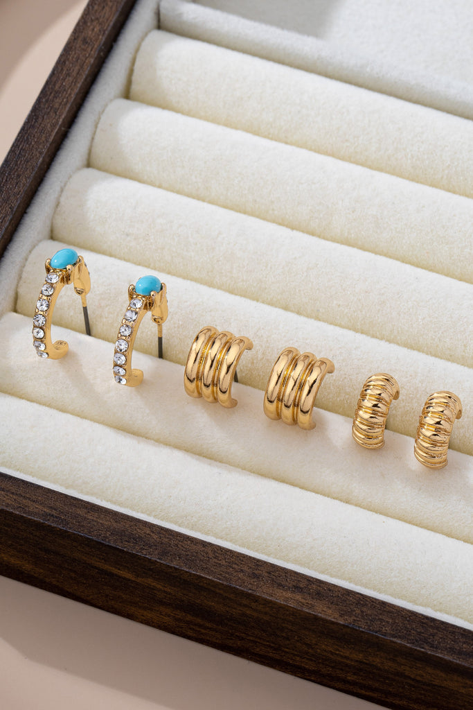 Gold-tone mix of mini hoops with turquoise enamel turq rhinestone, textured ridges, and beaded ball details for versatile, boho-chic ear stacking.