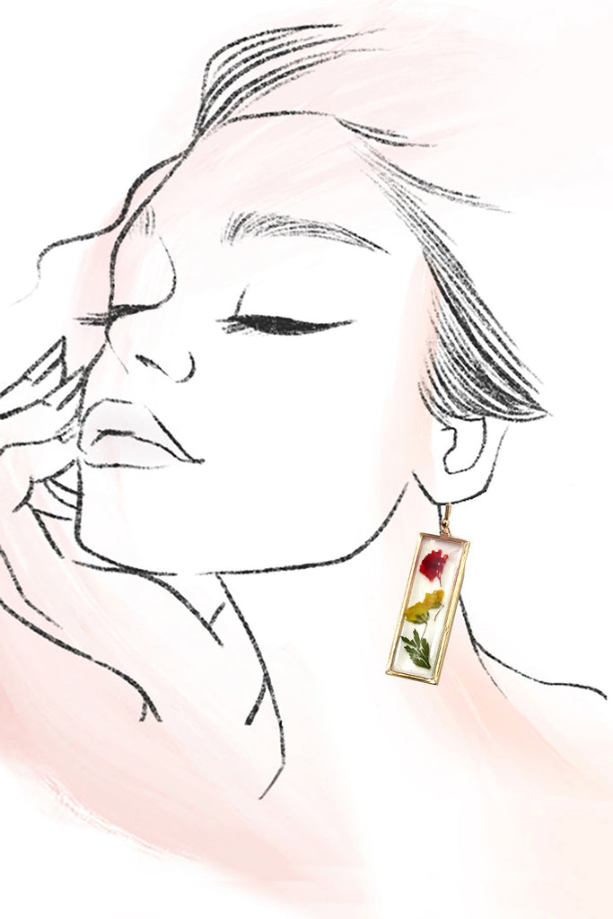 Vintage Handmade Dried Flower Earrings, a delicate and romantic earrings featuring rectangle. square, oval and cross-shaped drop encasing preserved dried flowers. This timeless piece blends nature's beauty with elegant design.