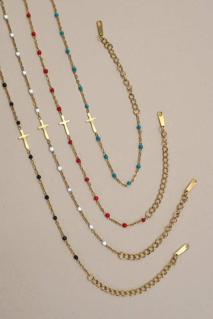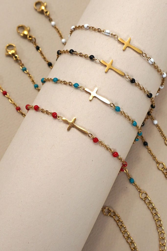 18K Stainless Steel Tarnish-Free Cross on a Beaded Bracelet. Crafted from high-quality stainless steel with an 18K gold finish, this bracelet is designed to resist tarnish and maintain its shine. The beautiful faith cross charm on a beaded stainless steel bracelet.