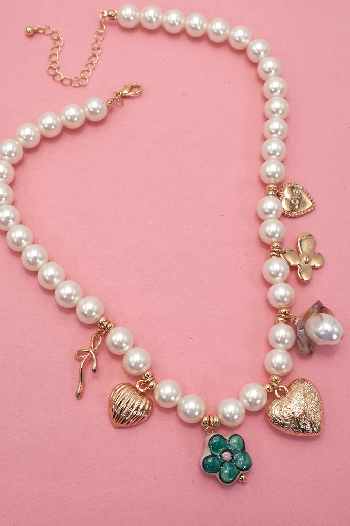 Stunning necklace showcases a beautifully multi charm necklace, featuring an exquisite combination of ceramic porcelain toile pattern charms, flower, ball, heart and heart charm, elegantly suspended on a pearl chain.