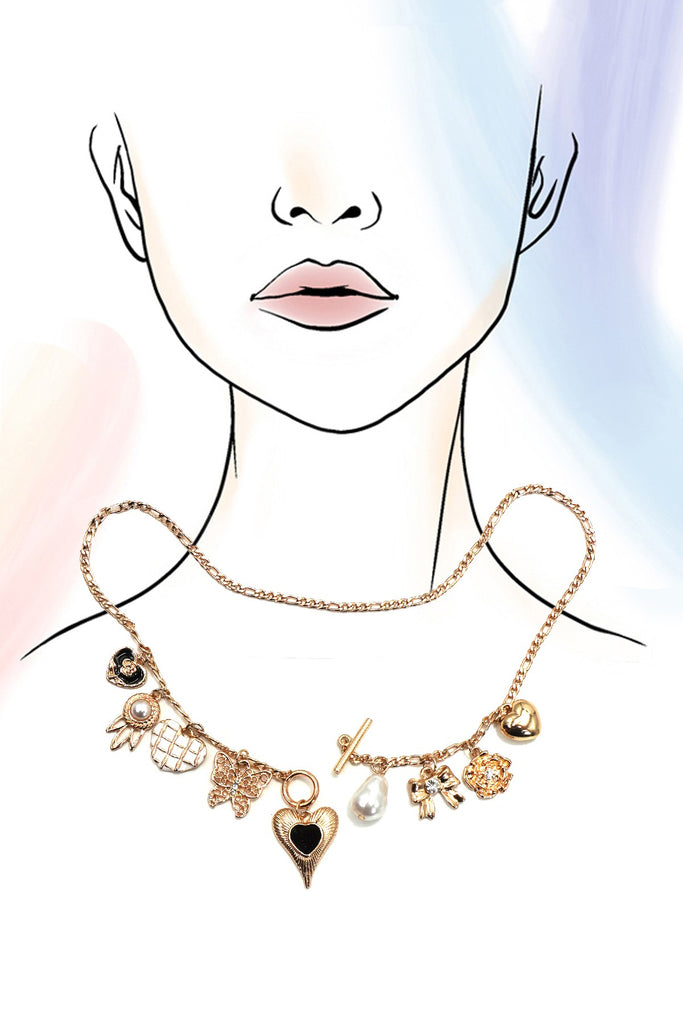 Charm Toggle Necklace, featuring an elegant toggle clasp and a charming mix of heart, bow, butterfly, and pearl accents. This delicate piece blends timeless elegance with playful details, perfect for layering.