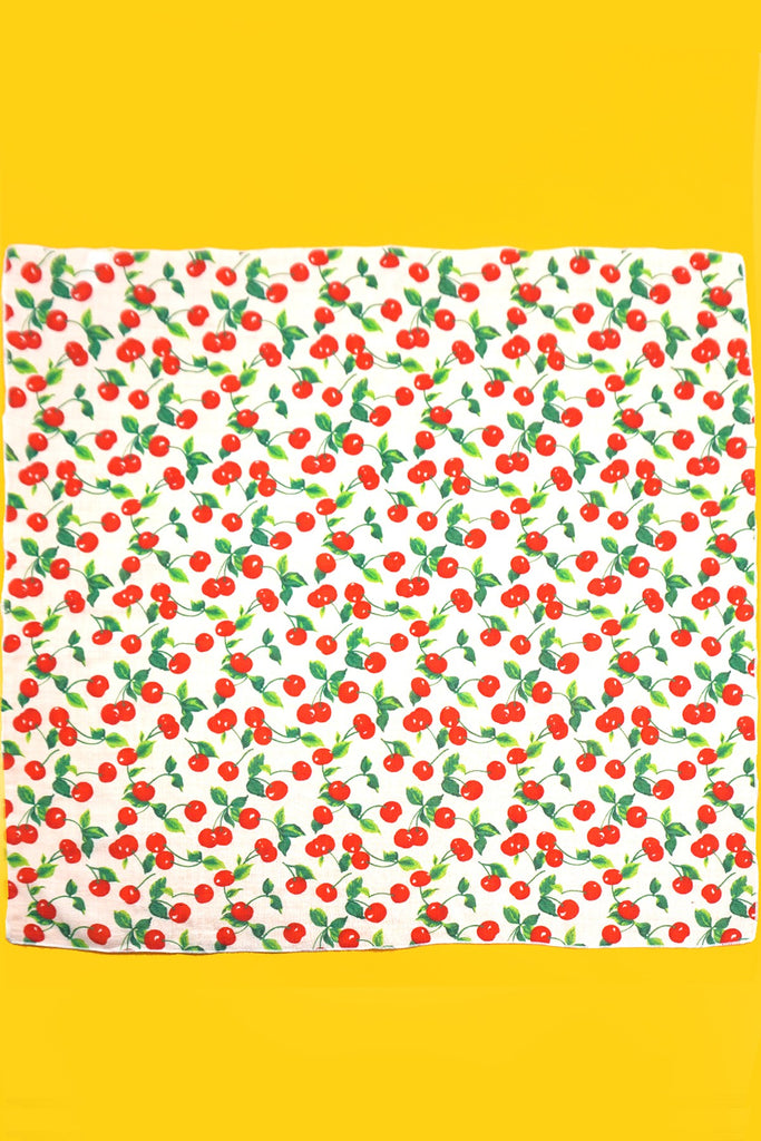 Cherry Print Cotton Silky Feel Bandana Scarf, made from luxurious cotton with silky-feel fabric, this bandana scarf features a delightful cherry print design. Whether you wear it as a headband, neck scarf, wrist wrap, or tie it to your bag for a pop of color, this scarf is sure to make a statement.