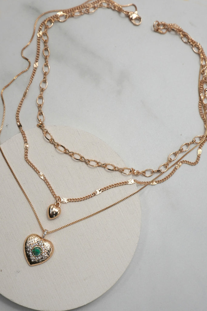 Multi-Layer Gemstone Heart Pendant Necklace Set, a beautifully crafted layered necklace set featuring multiple delicate chains, each adorned with a stunning gemstone heart pendant.