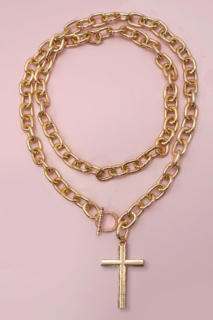 Puffy Cross Chunky Chain Statement Toggle Necklace. Featuring a high-shine, oversized chain with toggle closure and a dimensional puffy cross pendant. Perfect gift for the holidays, including Christmas, Mother's Day, Valentine's Day.
