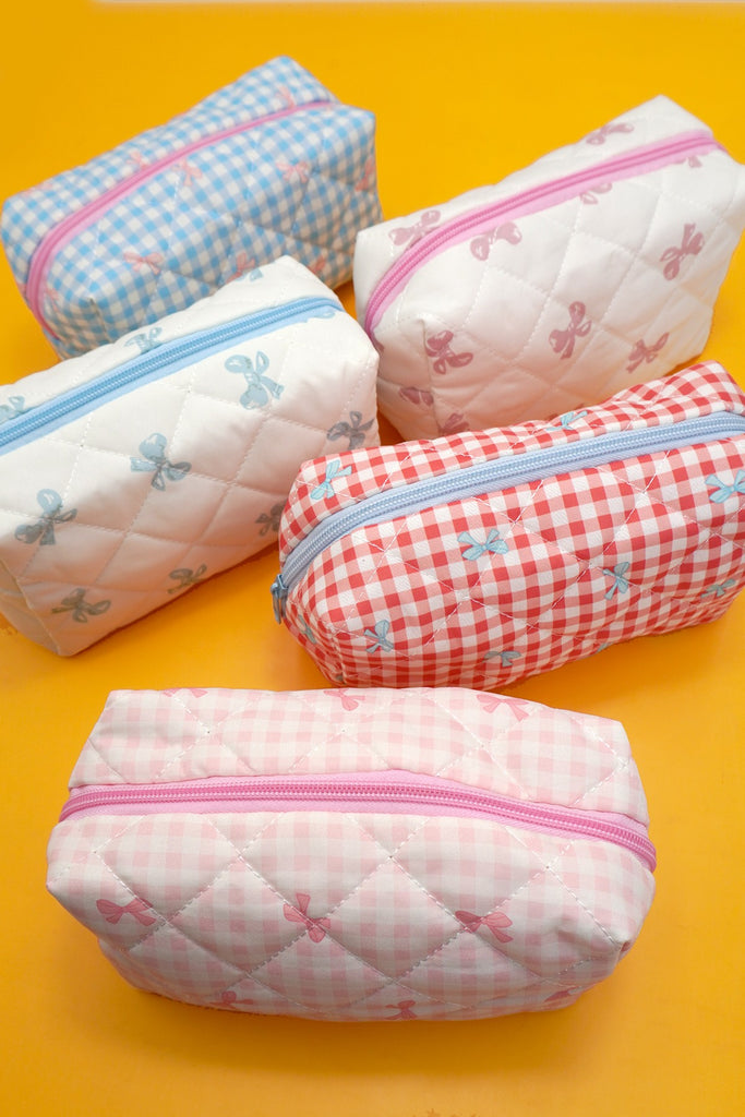 Quilted Cotton Bow Cosmetic Pouch Bag, made from soft quilted cotton, features a delicate checker & bow detail for a feminine and elegant look. Perfect for organizing makeup, skincare, or small accessories, it is lightweight, durable, and ideal for both travel and everyday use.