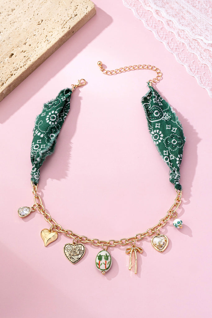 Necklace combines a soft green bandana-print fabric tie with a chunky gold-tone chain, adorned with a charms including a puffed heart, textured heart, floral enamel sphere, faceted crystal drop, bow. The mix of rustic textile and polished metal creates a bohemian look.