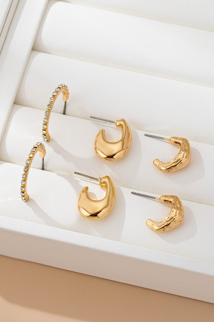 Gold-tone mix of smooth tapered huggies, chunky dome hoops, and rhinestone half-band designs for sleek, modern ear layering.