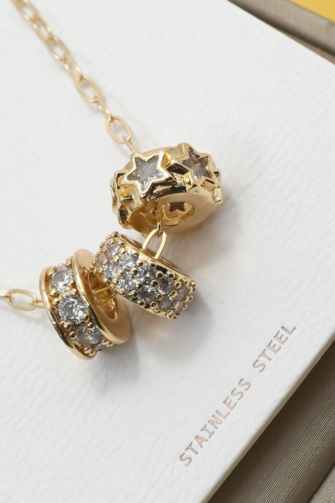 18K Stainless Steel Tarnish-Free Mixed Style Barrel Rhinestone Necklace, Triple mixed style zircon Barrel Rhinestone charm on chain necklace. Crafted from high-quality stainless steel with an 18K gold finish, this necklace is designed to resist tarnish and maintain its shine.