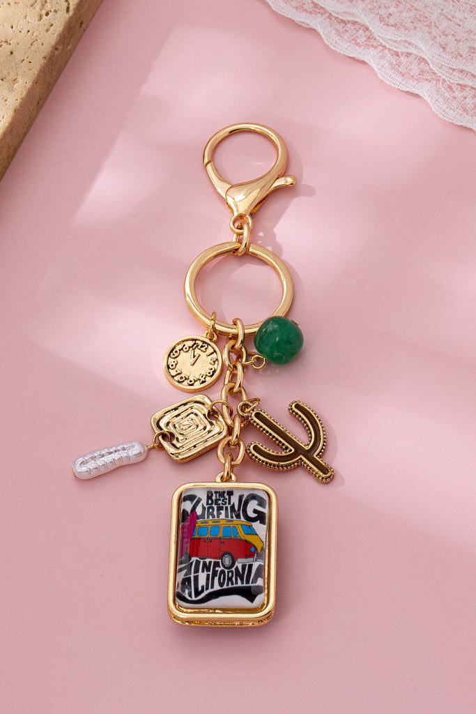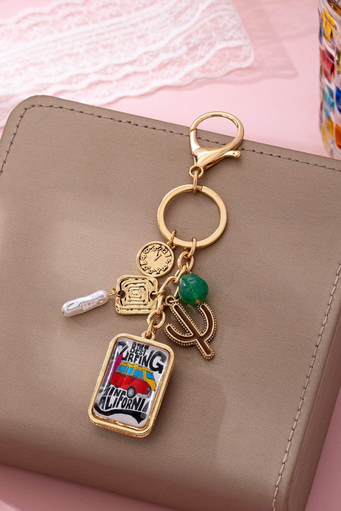 Featuring a colorful "Best Surfing California" pendant with van and surfboard graphic, plus eclectic charms like a cactus, green agate bead, faux pearl drop, spiral square, and engraved coin. Lightweight with a lobster clasp, it's perfect for adding playful, adventurous flair to keys, bags, or purses.