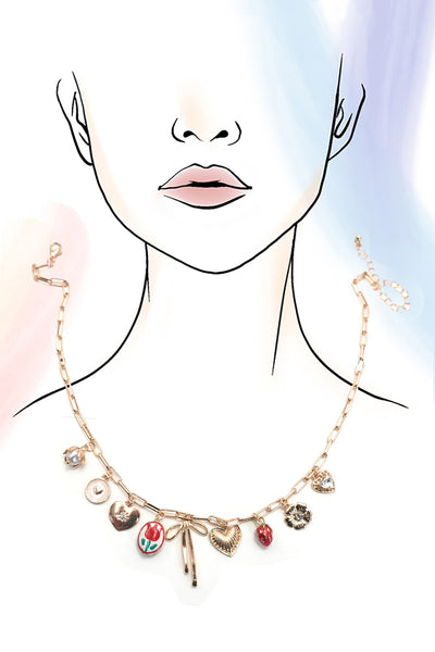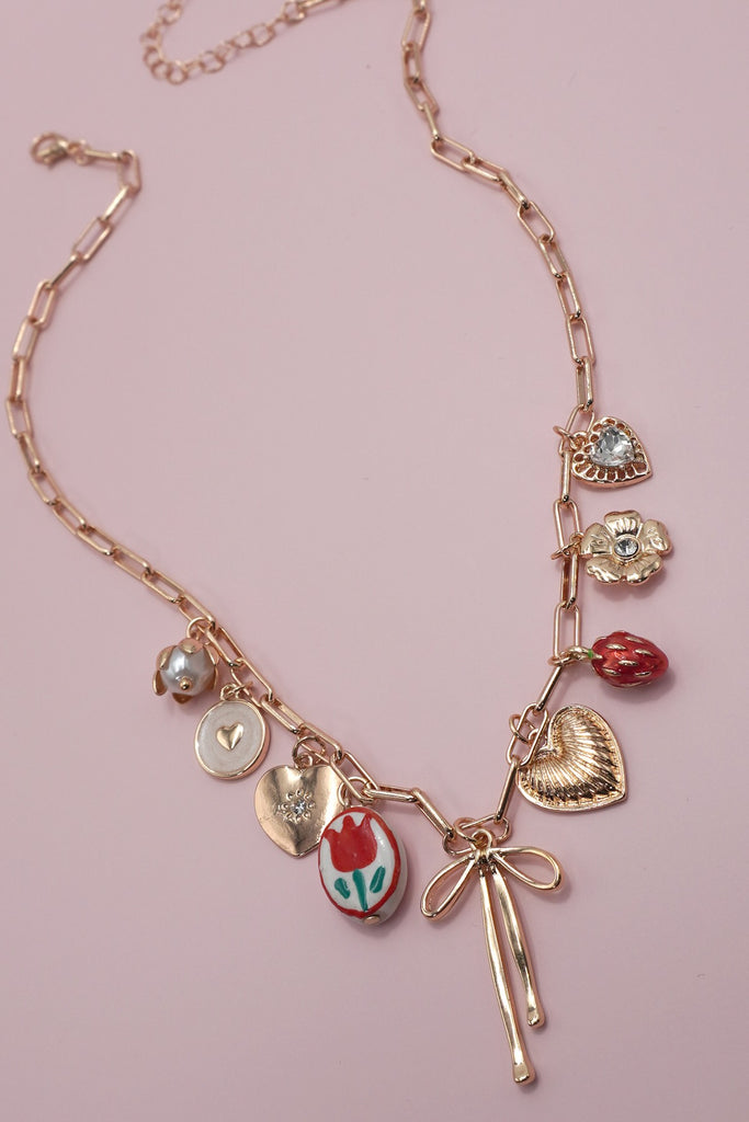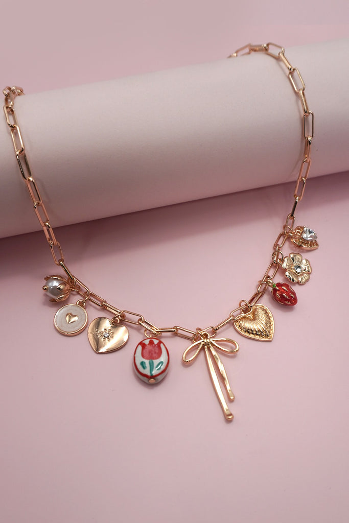 This stunning necklace features a delightful combination of charm elements, including a long bow, porcelain toile floral design, a gleaming gold heart, a vibrant red strawberry, and a dazzling rhinestone heart. The porcelain toile floral adds a touch of vintage elegance, while the gold heart and red strawberry bring in a fun and romantic flair.
