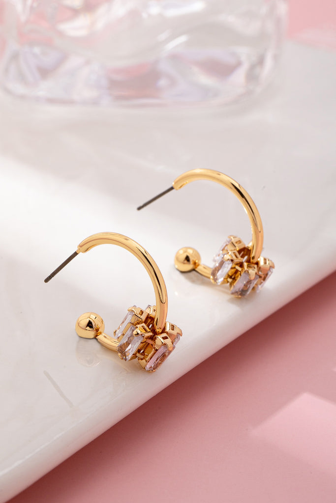 Sleek gold-tone ear climbers featuring sparkling baguette-cut clear crystals clustered at the base for eye-catching shine. Curved hoop design with secure post backing and ball accents.