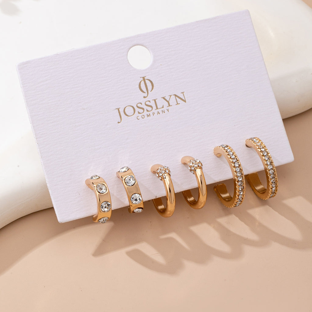 Chic gold-tone huggie hoop earring set in graduated sizes, featuring sparkling clear crystal accents-some fully pavé-set, others with single stones or clusters. Easy snap closure for secure, comfortable wear. Versatile mix of subtle shine and modern minimalism.