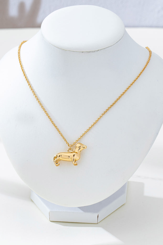 Minimalist necklace features a delicate gold-tone cable chain designed for a subtle and elegant look. A standout feature of the piece is the polished dachshund pendant, which showcases the breed's iconic long silhouette and short legs with a smooth, high-shine finish.