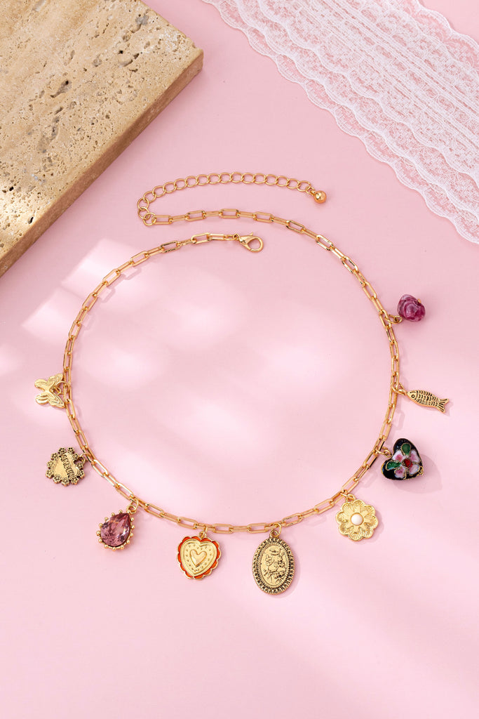 Gold-tone paperclip chain necklace features a playful cascade of heart pendants, a delicate butterfly, blooming flower, purple glass bead, and ornate medallions in soft pink and gold hues. Lightweight and adjustable, it adds instant romantic, vintage-inspired magic to any neckline.