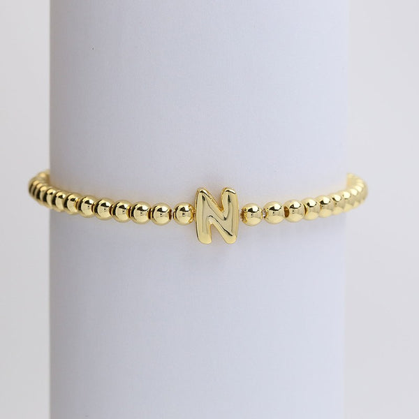Initial Monogram Bubble Stretch Bead Bracelet, a personalized accessory that combines elegance and charm. This bracelet features smooth, bubble-like initial on a round circular beads strung on a stretch band for a comfortable fit, adorned with a customizable initial monogram.