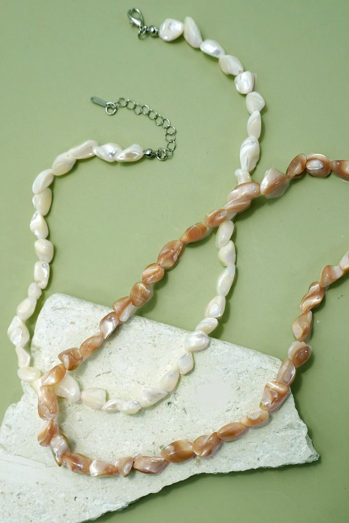 These elegant necklaces feature organically shaped mother-of-pearl nuggets with a luminous, iridescent sheen, creating a natural, beach-inspired look. Finished with a sleek stainless steel lobster clasp and adjustable extender chain, they provide a lightweight, polished accessory ideal for everyday wear or layering with other delicate pieces.