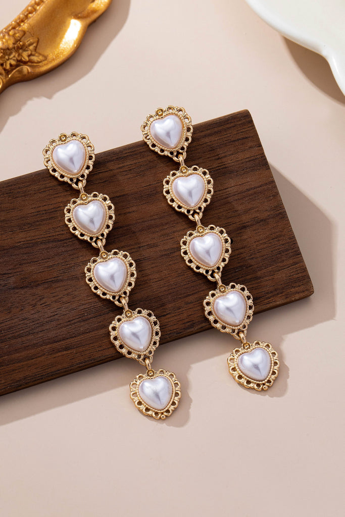 Gold-tone linear drops feature five linked heart-shaped stations, each cradling a luminous faux pearl within ornate scalloped frames. Cascading with vintage glamour and soft shine.