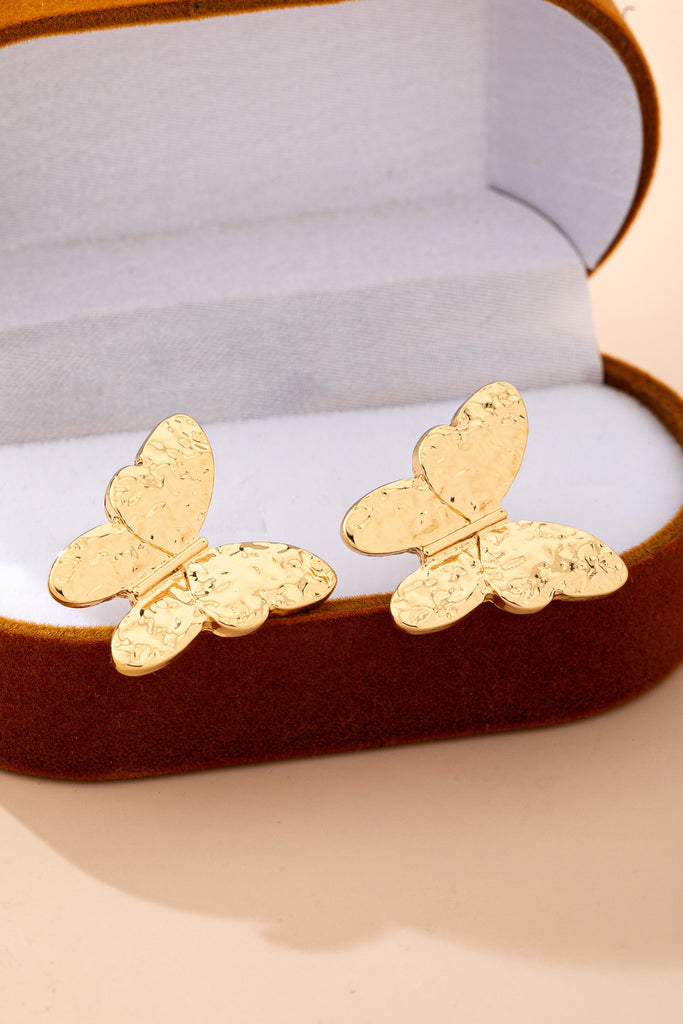 Gold-toned butterfly stud earrings. Each beautifully detailed butterfly features a hammered, textured finish that catches light with subtle shimmer and dimension, creating a soft, organic glow.