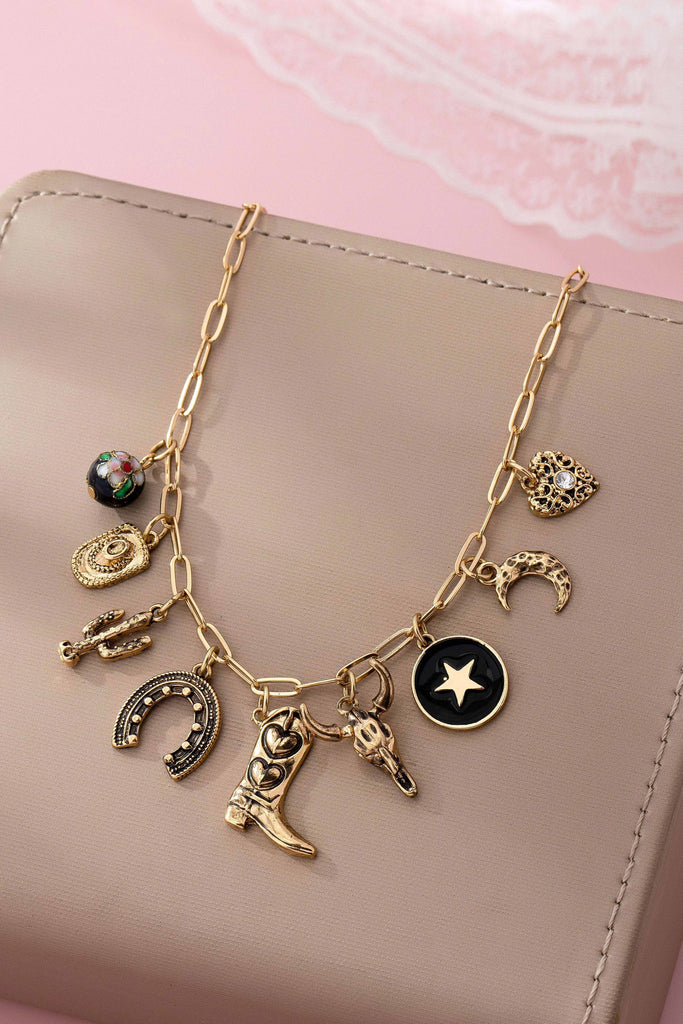Features gold-tone paperclip chain adorned with Western-inspired charms: a radiant porcelain heart, cactus, grey heart, ornate cowboy boot, filigree cross, cowboy hat, and cross. Perfect for layering or standalone wear, it brings bold cowgirl flair to any outfit.